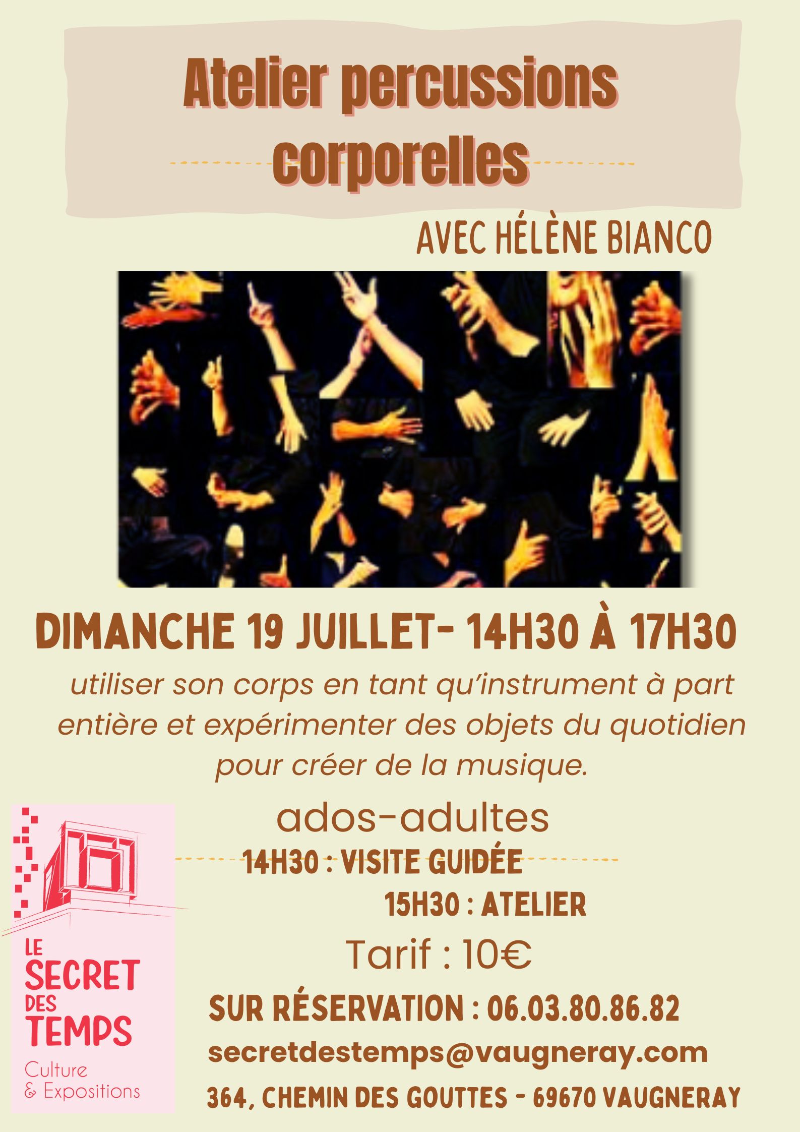 Hélène Bianco vous propose la découverte d’une forme artistique en vous initiant aux percussions corporelles.