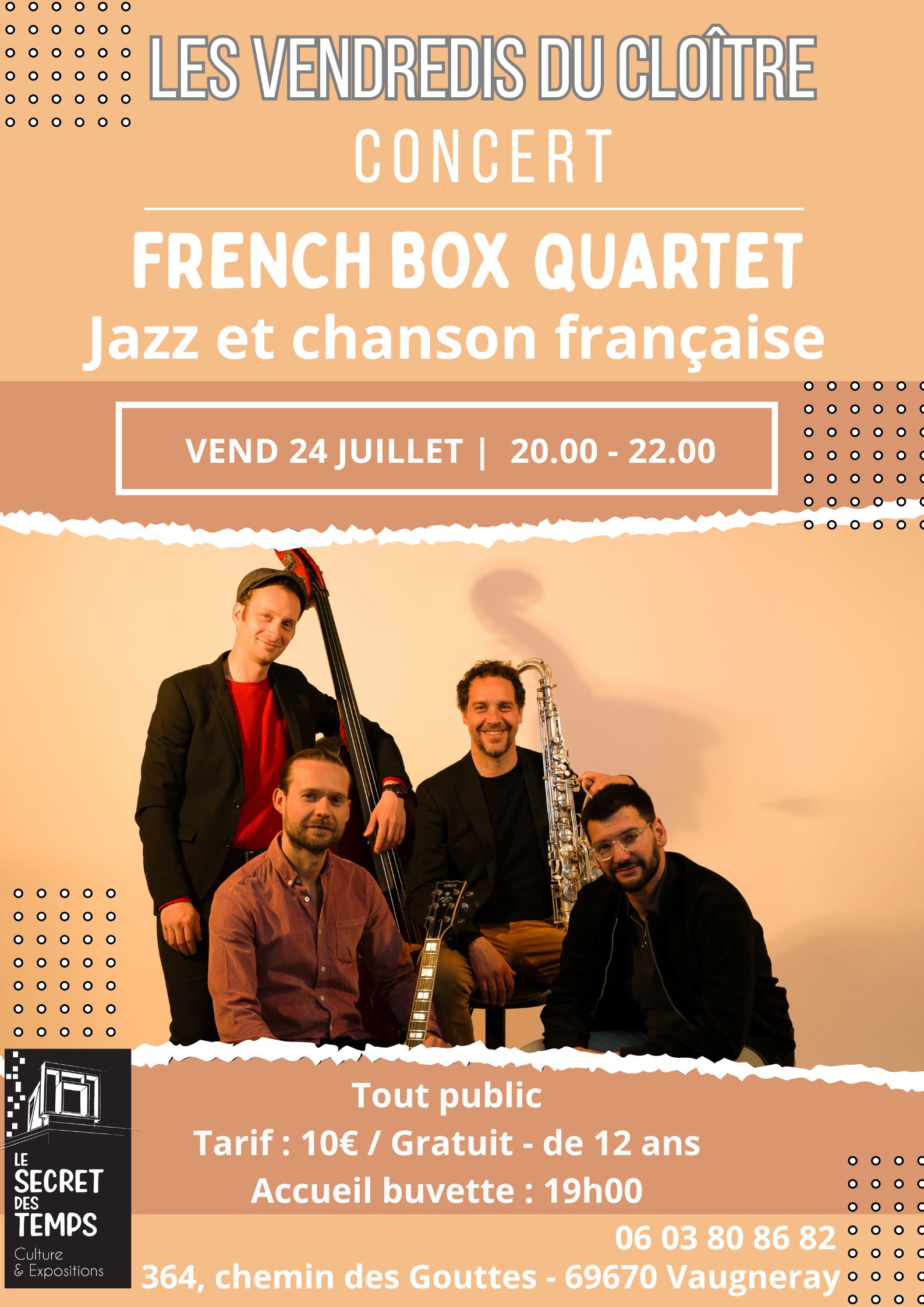 Le French Box Quartet propose des standards de la chanson française. Le quartet manie les codes du jazz (blues, swing, musiques latines...) et s'amuse en improvisant sur un patrimoine connu de tous. Barbara, Brel, Dalida, Dassin, Gainsbourg...